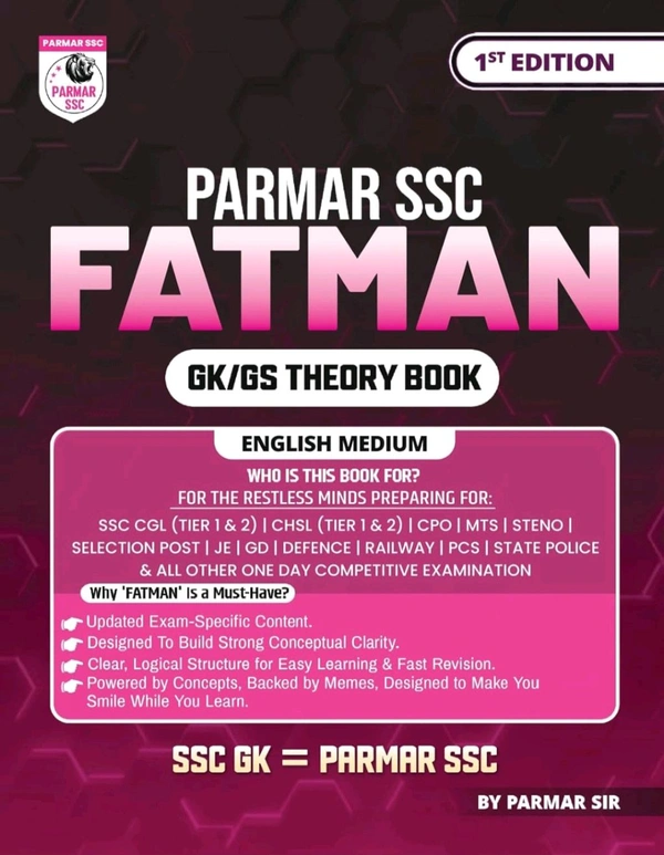 Parmar SSC Fatman GK/GS Theory Book is a power-packed and updated compilation tailored for aspirants preparing for SSC CGL, CHSL (Tier 1 & 2), CPO, MTS, Steno, Selection Post, GD, JE, Railway, PCS, State Police, and all other One Day Competitive Examinations.